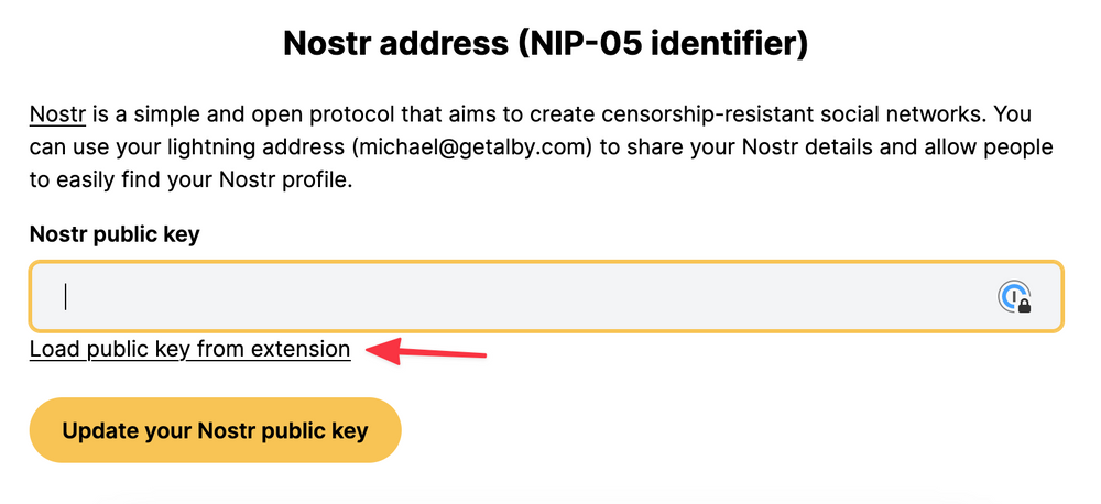 Vai su getalby.com, fai login e clicca su "Settings" -> "Profile settings" (nota: questo non si trova sull'estensione, ma su getalby.com). Carica la chiave pubblica Nostr cliccando su "load public key from extension" e salva. Ora le persone possono trovarti con [email protected] (ad esempio, io sono [email protected]).