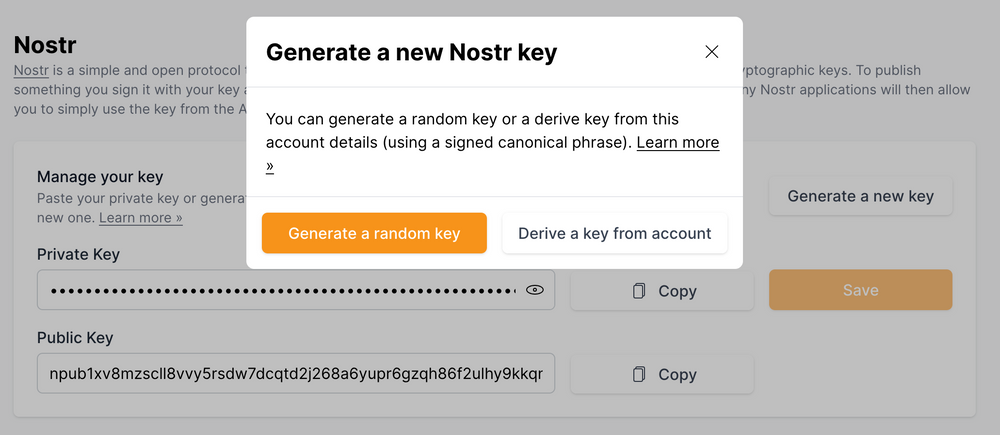 Nella sezione Nostr si configurano le chiavi. (per saperne di più sulle chiavi Nostr, clicca qui!) Ricordati sempre di non condividere mai la tua chiave privata e di fare un backup!