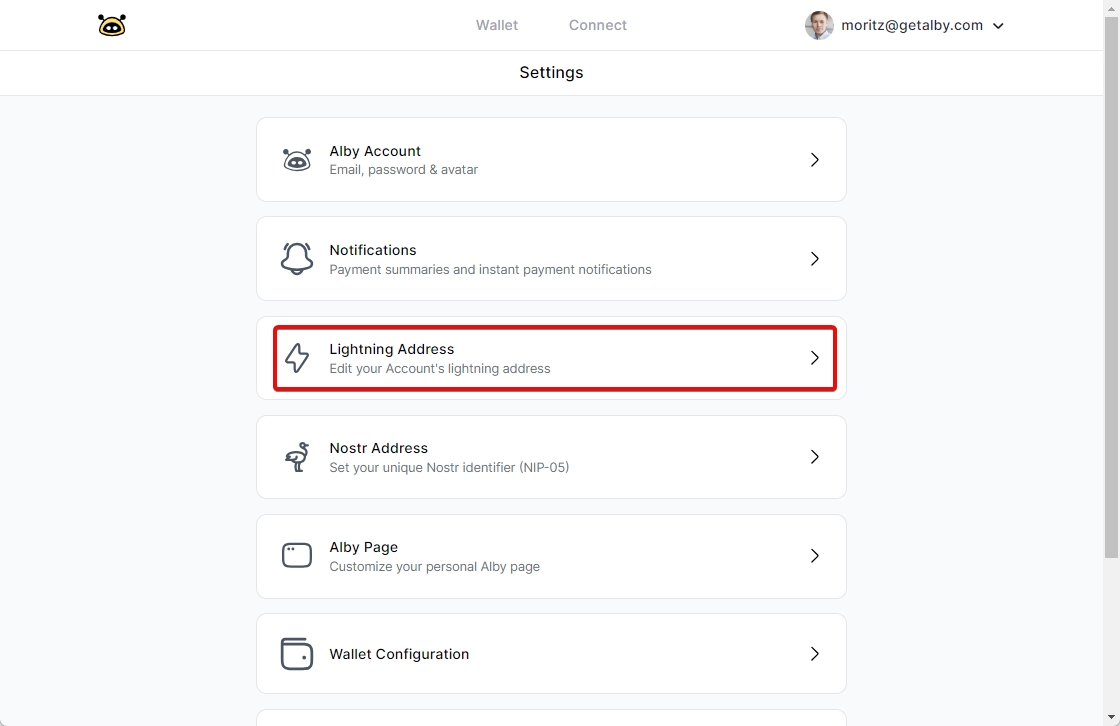 Your lightning address is an important tool for to receive bitcoin payments. It is easy to share and remember. That's why Alby gives you one by default, when you sign up for an account.