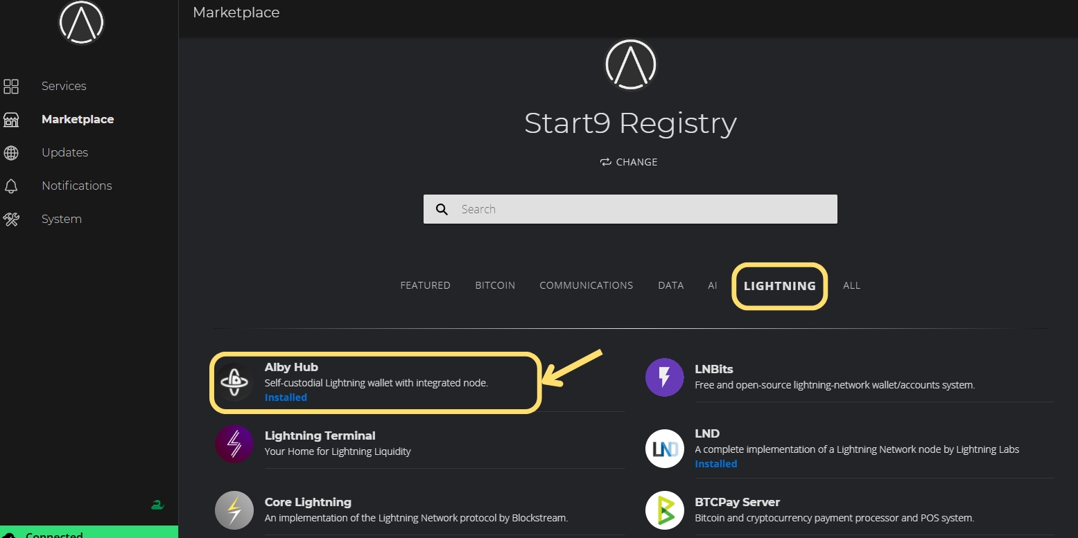 Just go to the Start9 Marketplace, then look for the Alby Hub under the "Lightning" Section. Install.