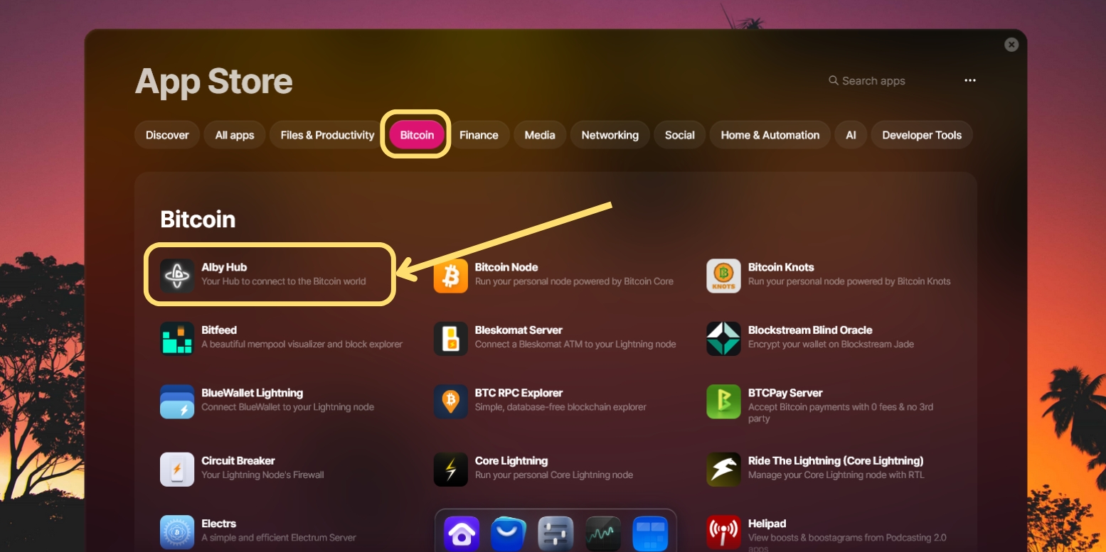 Just go to the Umbrel's App Store, then look for the Alby Hub under the "Bitcoin" Section. Click & Install.
