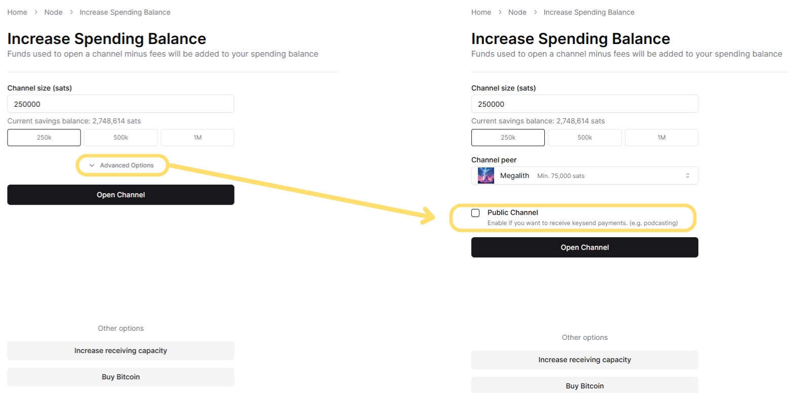 If you need public channels, check the "Public Channel" box for all the channels you open. Whether for increasing Spending Balance or Receiving Capacity, if you have one public channel, it's best to make all your channels always public.