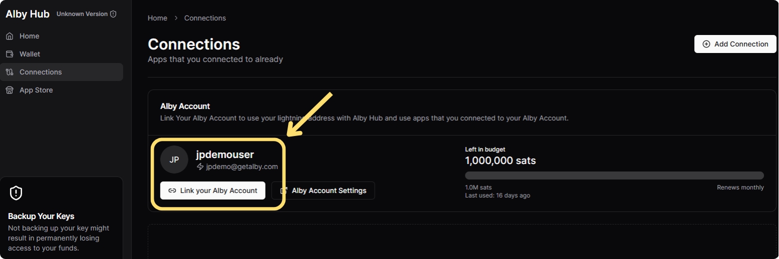 On your Alby Hub, go to "Connections" and click on "Link your Alby Account". It should be done in just a few seconds.