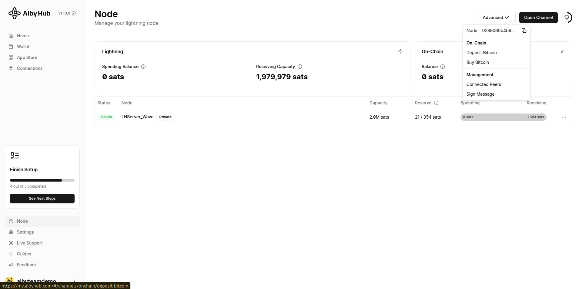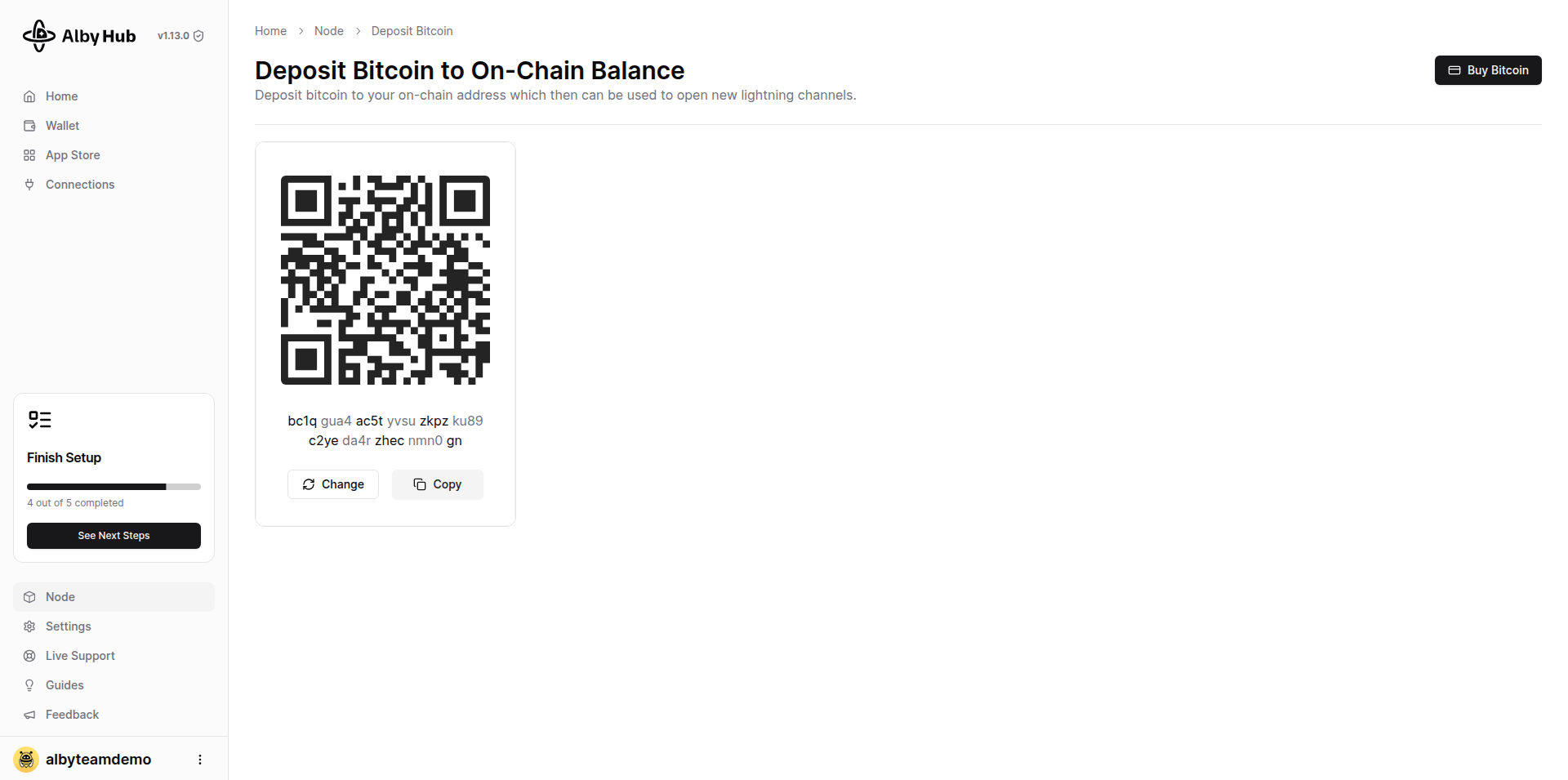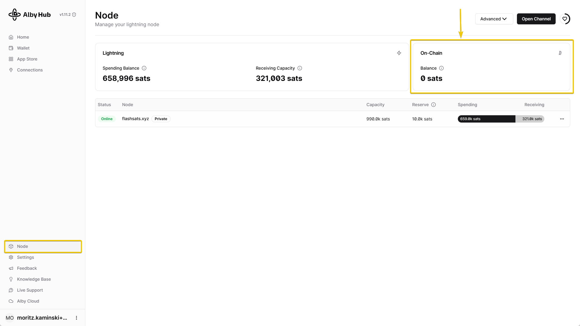 <figure><img src="https://content.gitbook.com/content/WIUBf3ZZaBGu2ee6Y8lU/blobs/W42kFAQEnoT4sFwudYJS/image.png" alt=""><figcaption><p>Your on-chain balance can be found in the Node section of your Alby Hub</p></figcaption></figure>