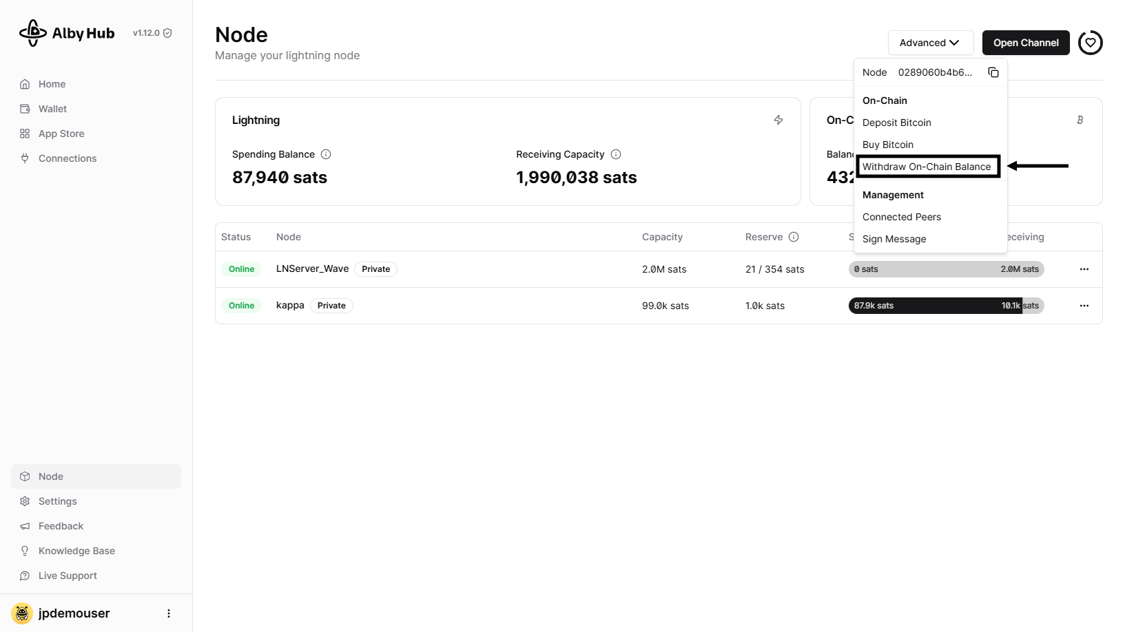 <figure><img src="https://content.gitbook.com/content/WIUBf3ZZaBGu2ee6Y8lU/blobs/h2PJ76XxYUqGvKrENYSq/Screenshot%2012-19-2024%2018.01.03.png" alt=""><figcaption><p>Click on Advanced and then on "Withdraw On-Chain Balance".</p></figcaption></figure>