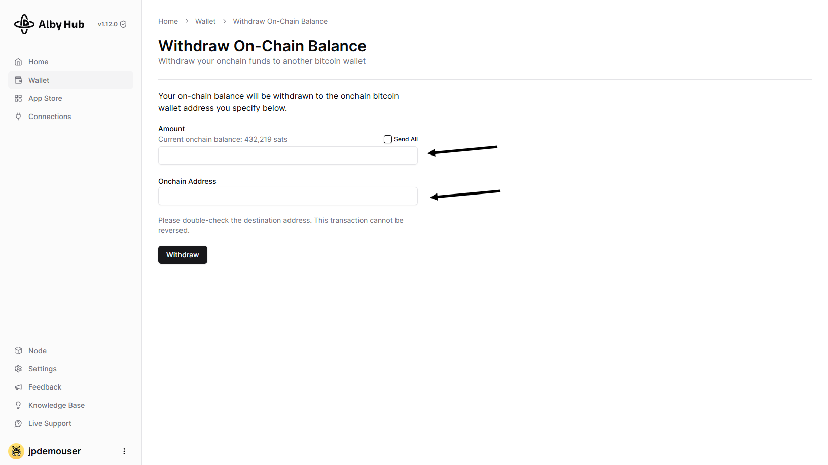 <figure><img src="https://content.gitbook.com/content/WIUBf3ZZaBGu2ee6Y8lU/blobs/qBV81FdMiE3zjeadLWrq/Screenshot%2012-19-2024%2018.01.56.png" alt=""><figcaption><p>Enter the on-chain bitcoin address where you want your On-Chain Balance funds to be redeemed.</p></figcaption></figure>