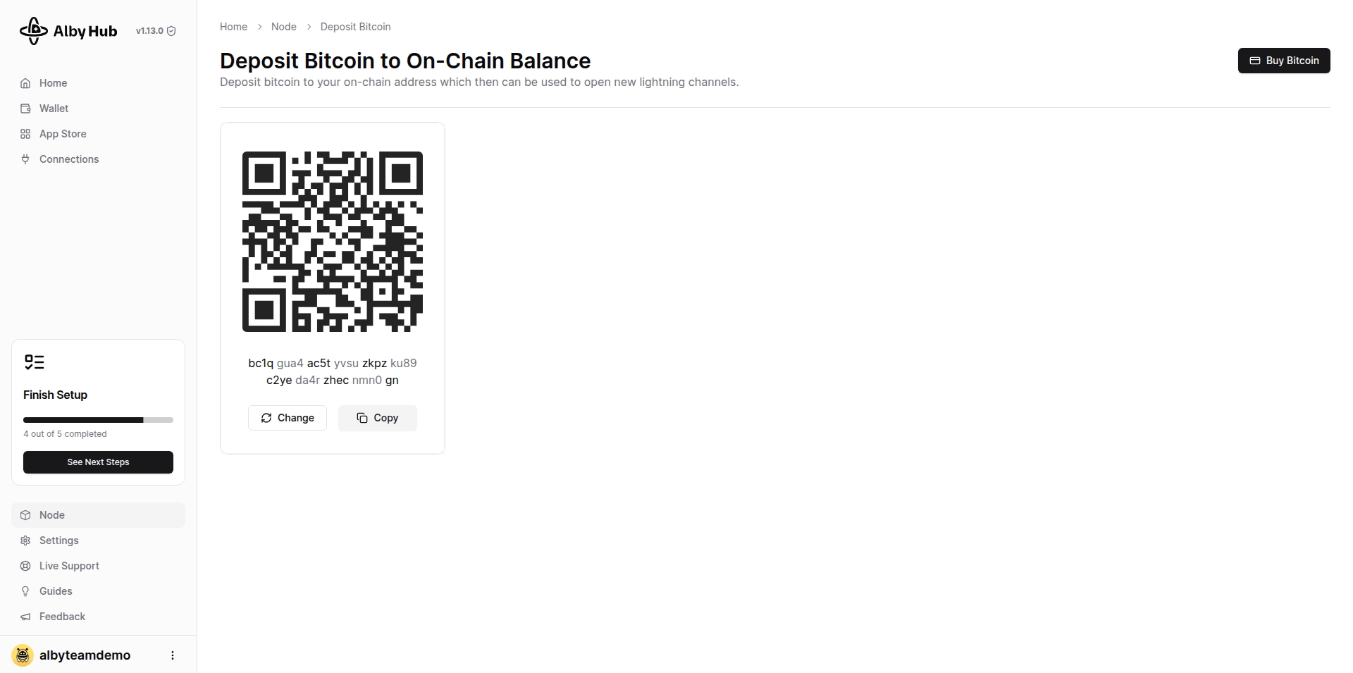 Go to the "Node" section, click on "Advanced", then click on "Deposit Bitcoin"
