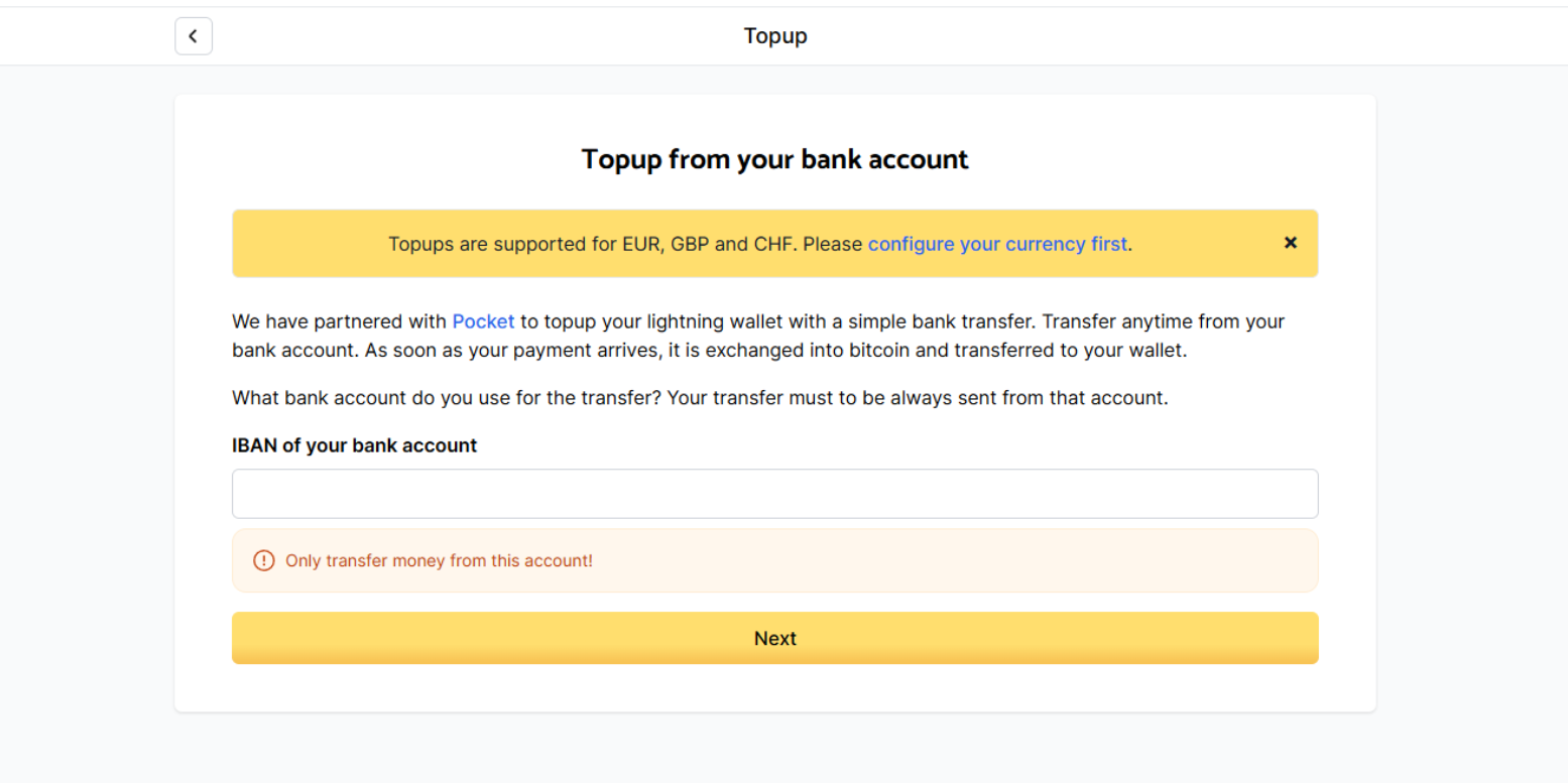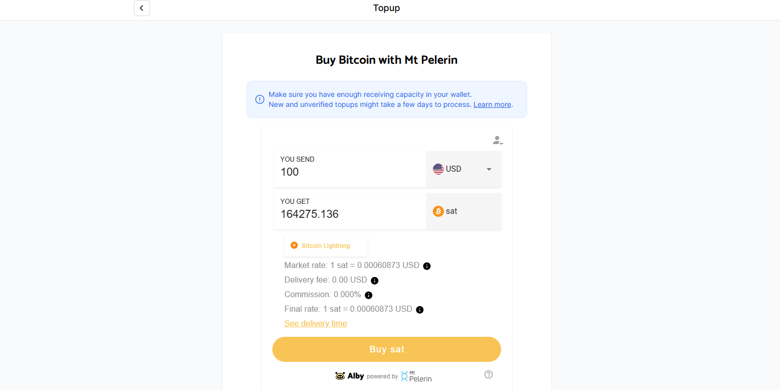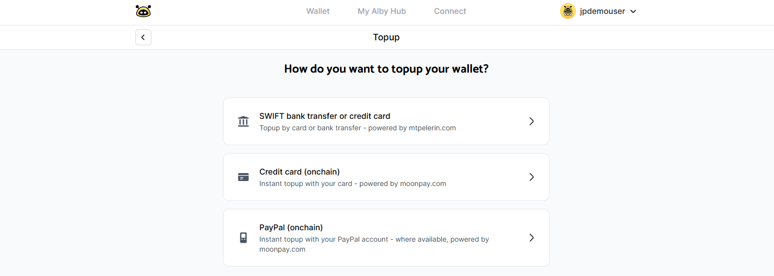 Youβll be redirected to your Alby dashboard to complete the purchase using SWIFT/SEPA, credit card. Only services from Pocket and Mt.Pelerin allow you to top up your Spending Balance directly. PayPal only works for top ups of your On-Chain Balance. Available payment options may vary depending on your country, as some methods are only compatible with specific regions. π