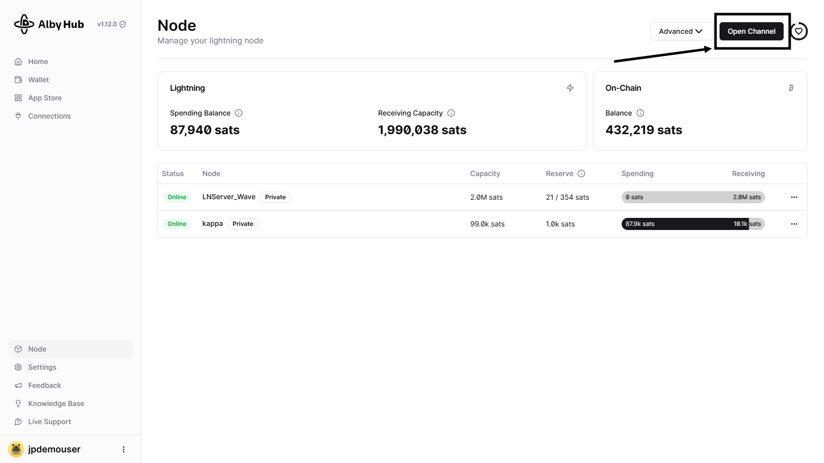 1. Navigate to the "Node" page and click on "Open Channel", then "Open a channel with on-chain" at the top right corner.