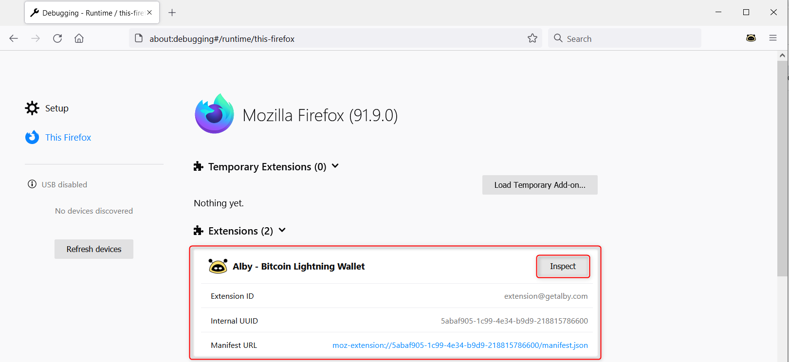 2. Step: Locate the Alby browser extension in your list and click on 'Inspect'