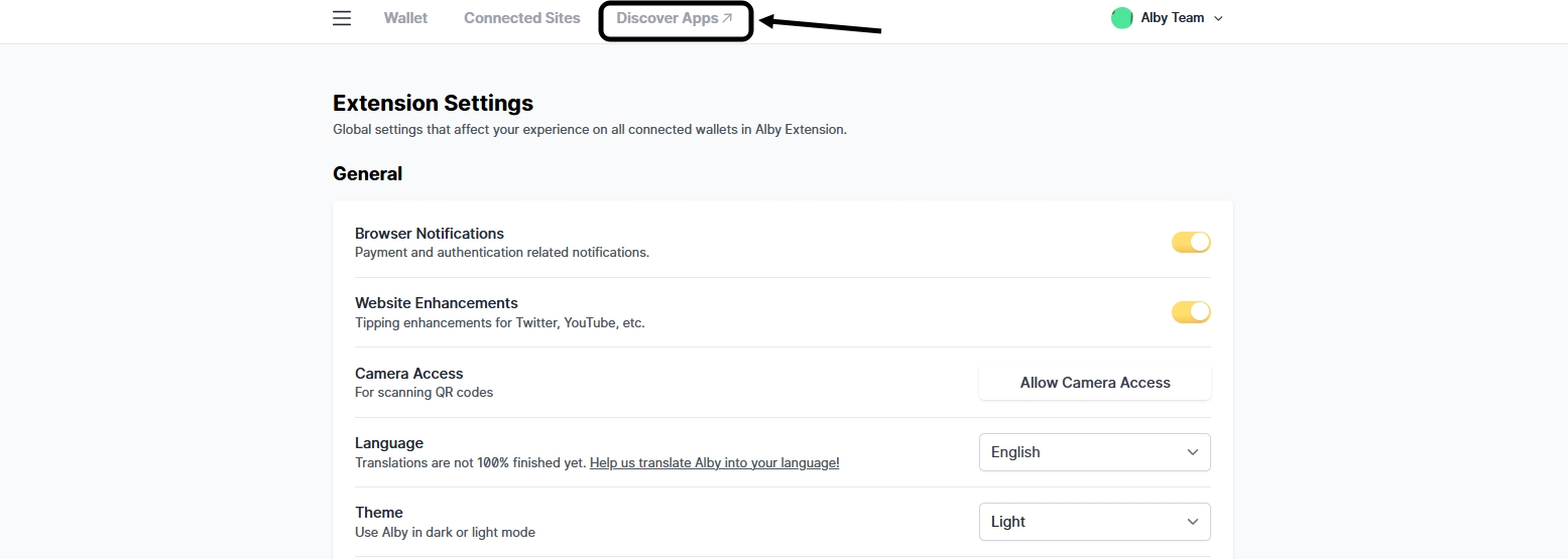 Alby provides a dedicated selection of bitcoin web apps within the browser extension