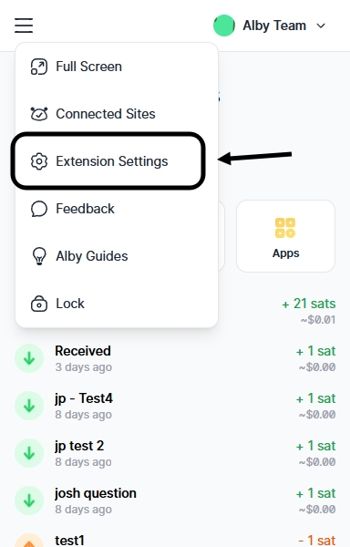 Step 1: Open the Alby browser extension and click on the menu button