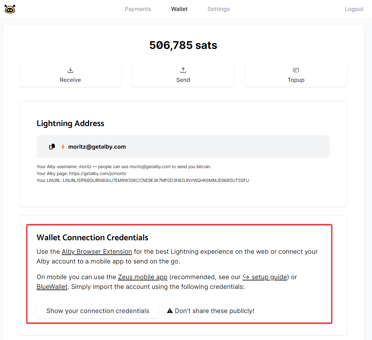 Step 5: Add your Alby Account credentials from Step 1
