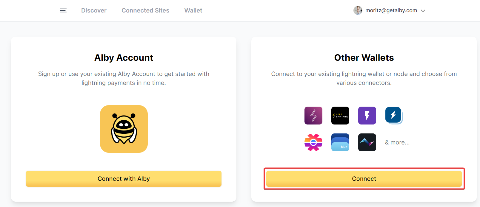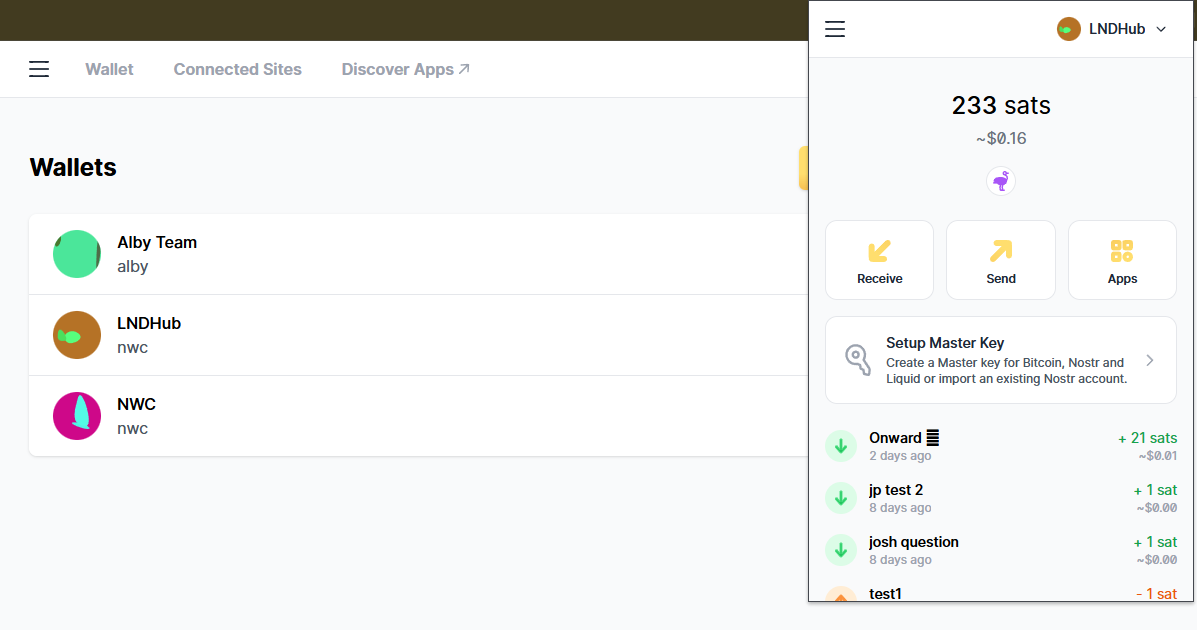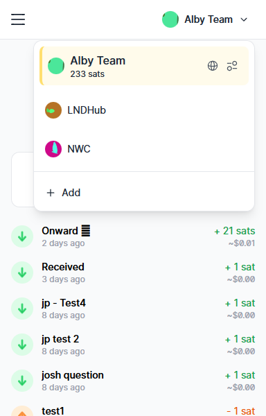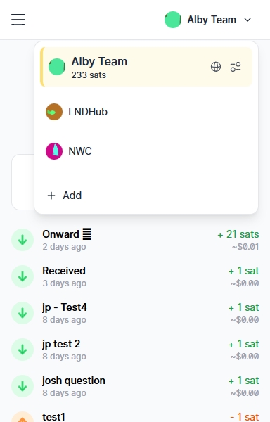 Step 5: Select the Account in the Alby extension via the account selector (top right)