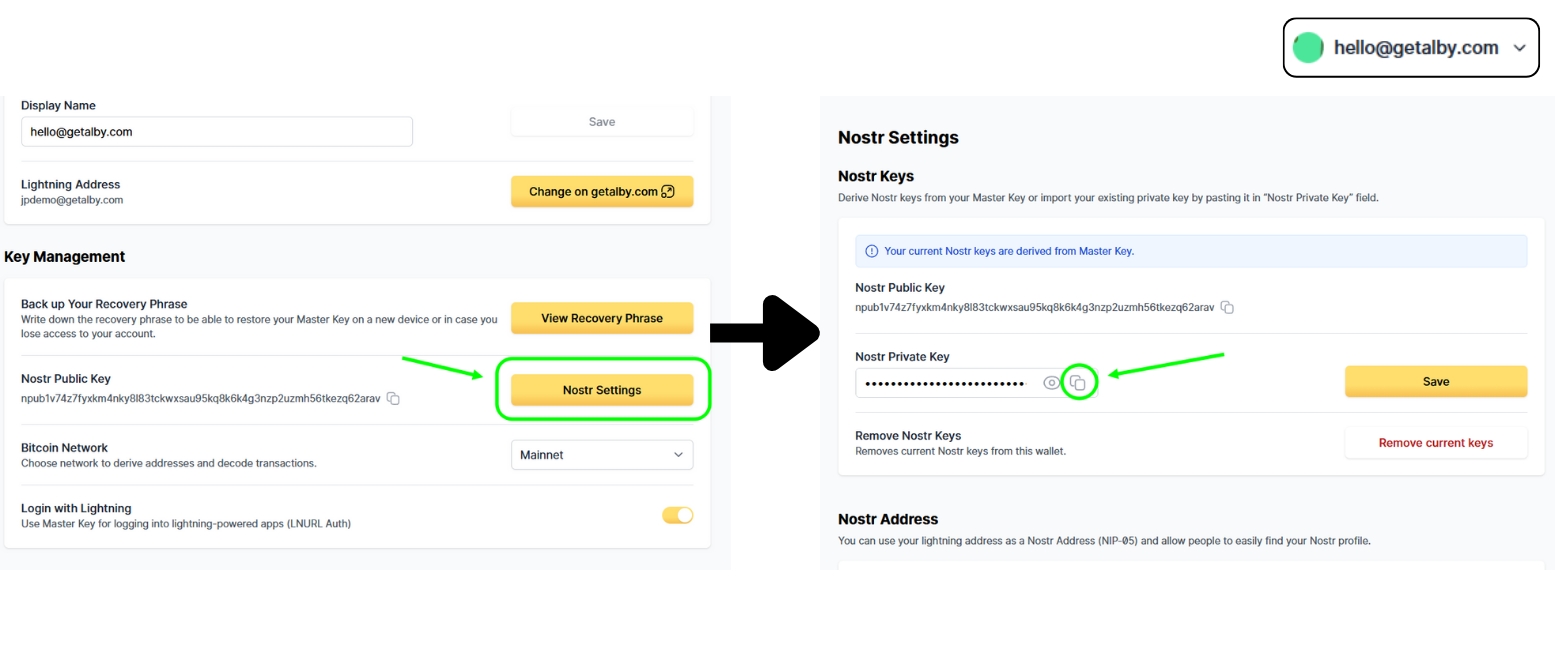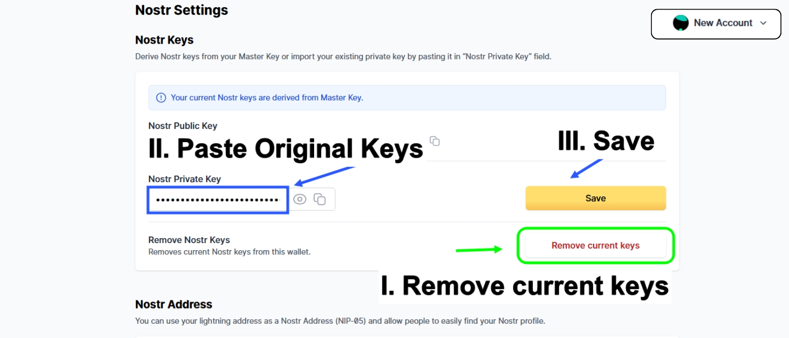 Step 2. Go to Nostr Setting, "Remove current keys", and then paste the Original Nostr Nsec keys and click on "Save".