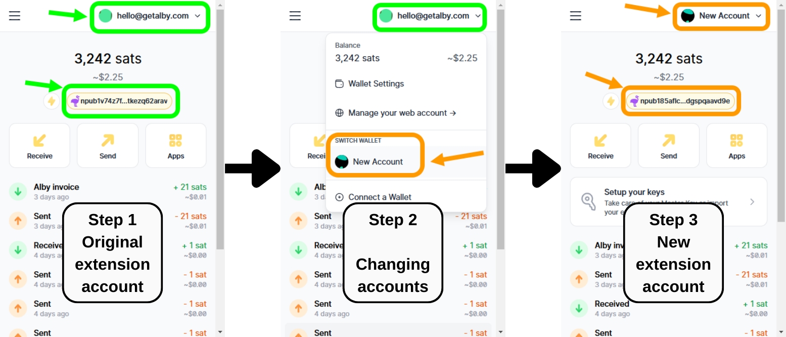 Even if both the Original account and the New account are associated with the same "Alby web account" or the same self-hosted node, the Nostr Nsec keys are never stored in Alby's servers and have nothing to do with our Alby web account. The Nostr Nsec keys are always stored inside your Alby extension in your browser. When making a new account on the extension, you will have a new Master key automatically provieded, and an automatically Nostr key derived from that master key into this New Account. To recover the old ones we have to place the old Master key or Nsec key manually.