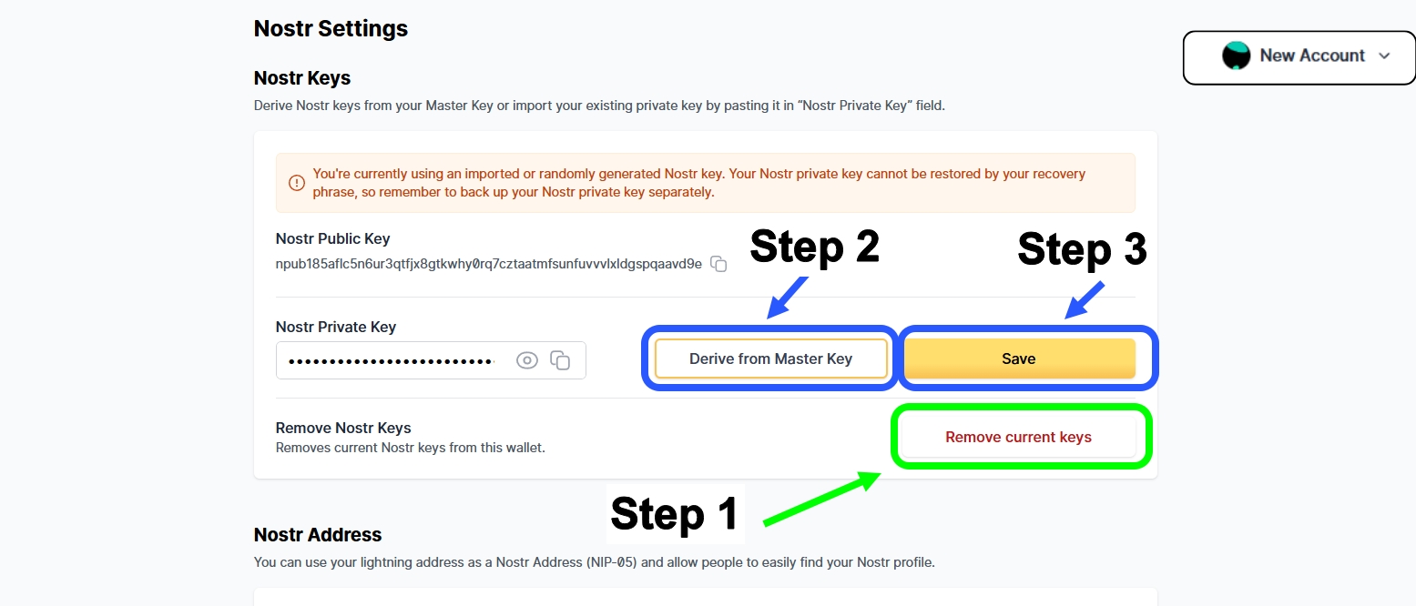 Step 4. Erase previous Nostr Keys, then "Derive Nostr Keys from current Master Key"