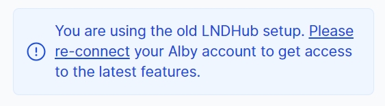 If you see the notification below in your browser extension, it means that your Alby Extension is using the old LNDHub setup to access your Alby Account (getalby.com). You should migrate to the new connector method and reconnect the extension to access the latest features.