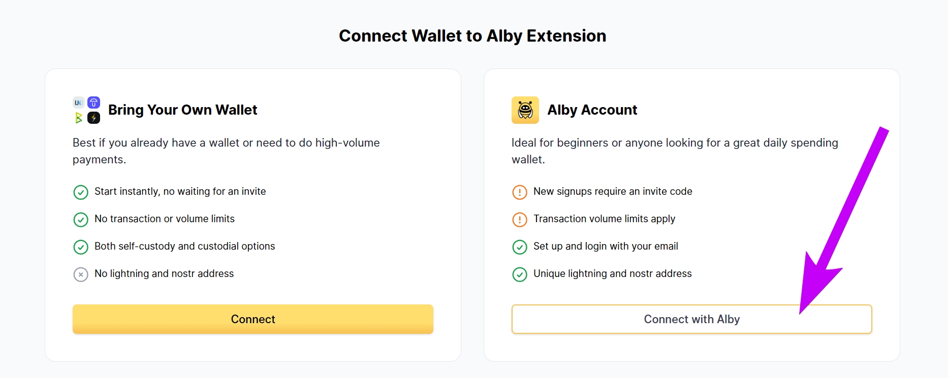 Choose "Connect with Alby": When prompted to Wallet Connect Page, opt for the "Connect with Alby" option. This will initiate linking the new wallet in the extension to the account on getalby.com.