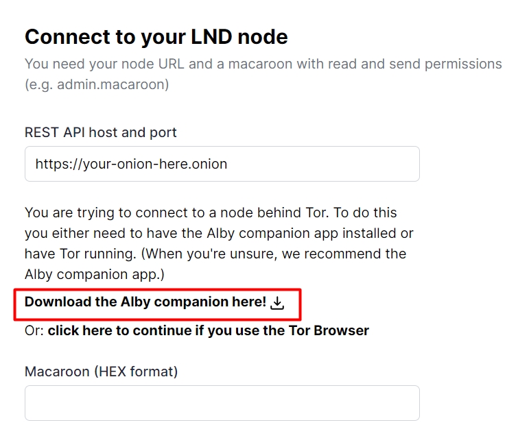 The Alby Companion App serves as a TOR proxy for your browser. The setup cannot be simpler: Just download and install it when you are asked so by the Alby extension. The file size is small. Installation happens within seconds.