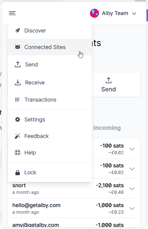 Step 1: Open Alby and select 'Connected sites' from the drop-down menu