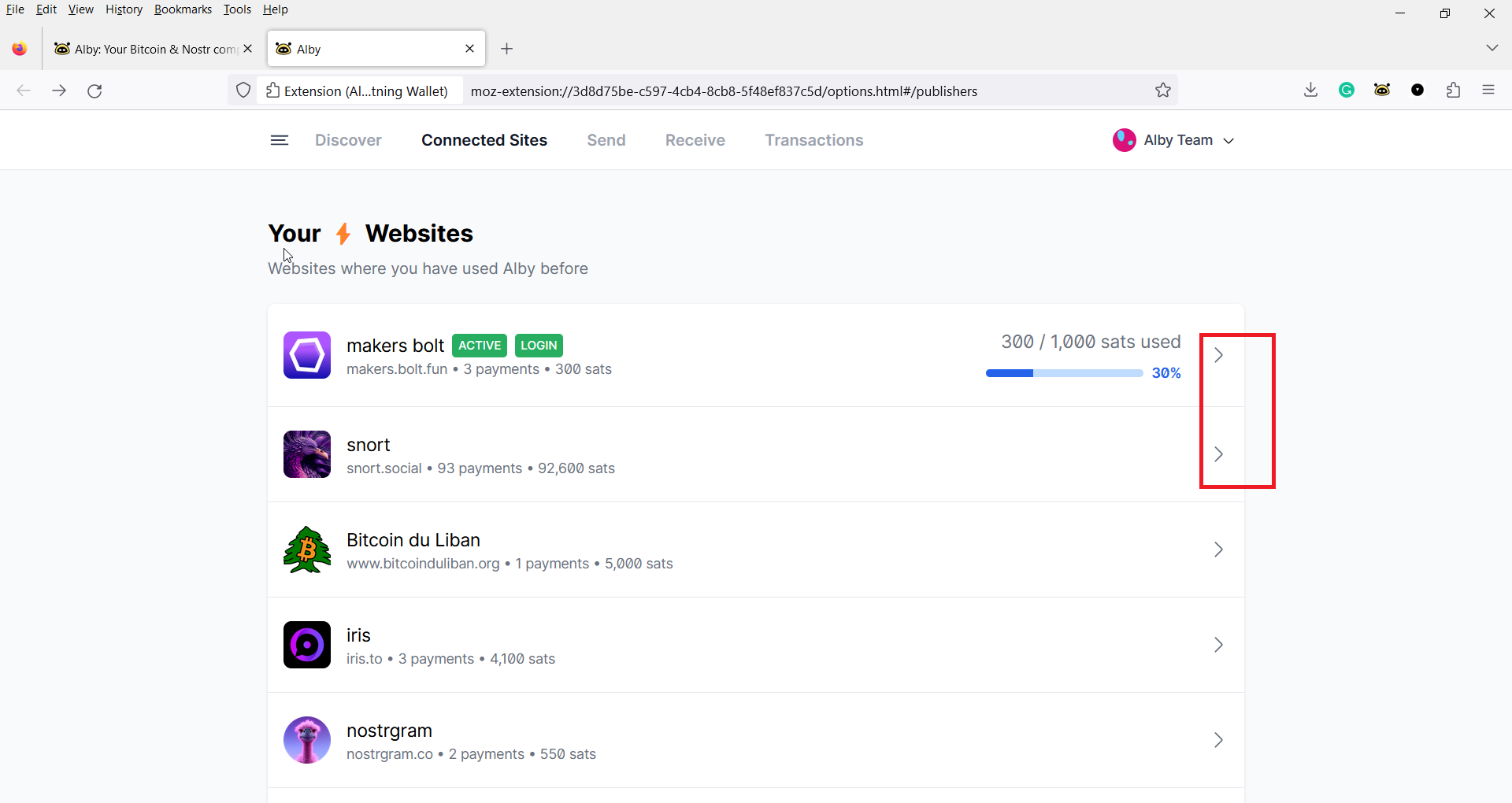 Before using Alby on a website, Alby always asks if you want to grant the website access to your account. Here’s how you can manage website permissions from the website list within Alby.