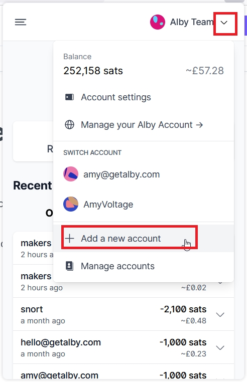 In your Alby browser extension, click the icon, open the wallets menu, and select "+ Add." Choose your Alby web account as the source wallet. For detailed instructions, click here: