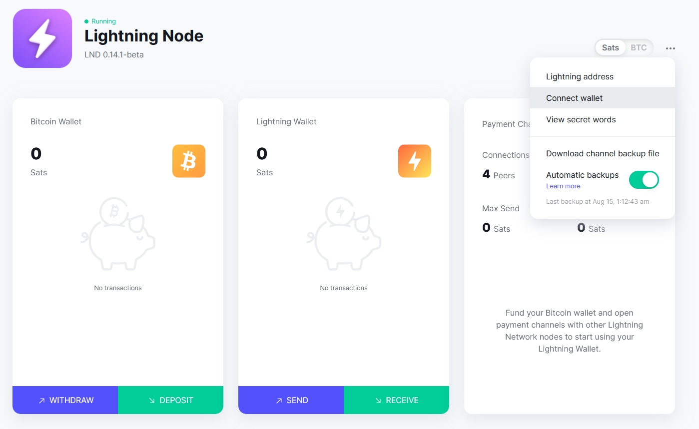 Optional: If you don't have lightning channels yet, you can follow this setup wizard to fund your node and open your first channel to send and receive bitcoin payments.